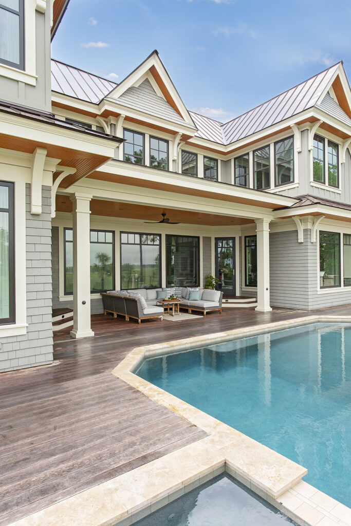 This Kiawah Island vacation home was designed with the natural beauty of the outdoors in mind. A soothing palette accented with warm woods and metals added depth throughout the project. The kitchen includes a custom island that is a focal point of the home. We were challenged to find a stone slab large enough to span the island without seams which was important to this design. In addition to the gathering space in the living and kitchen areas, there are several guest areas that accommodate their many visitors.
